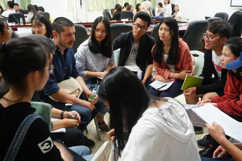 图为保加利亚小说家Vladimir Poleganov与中大新华学子探讨创意写作
