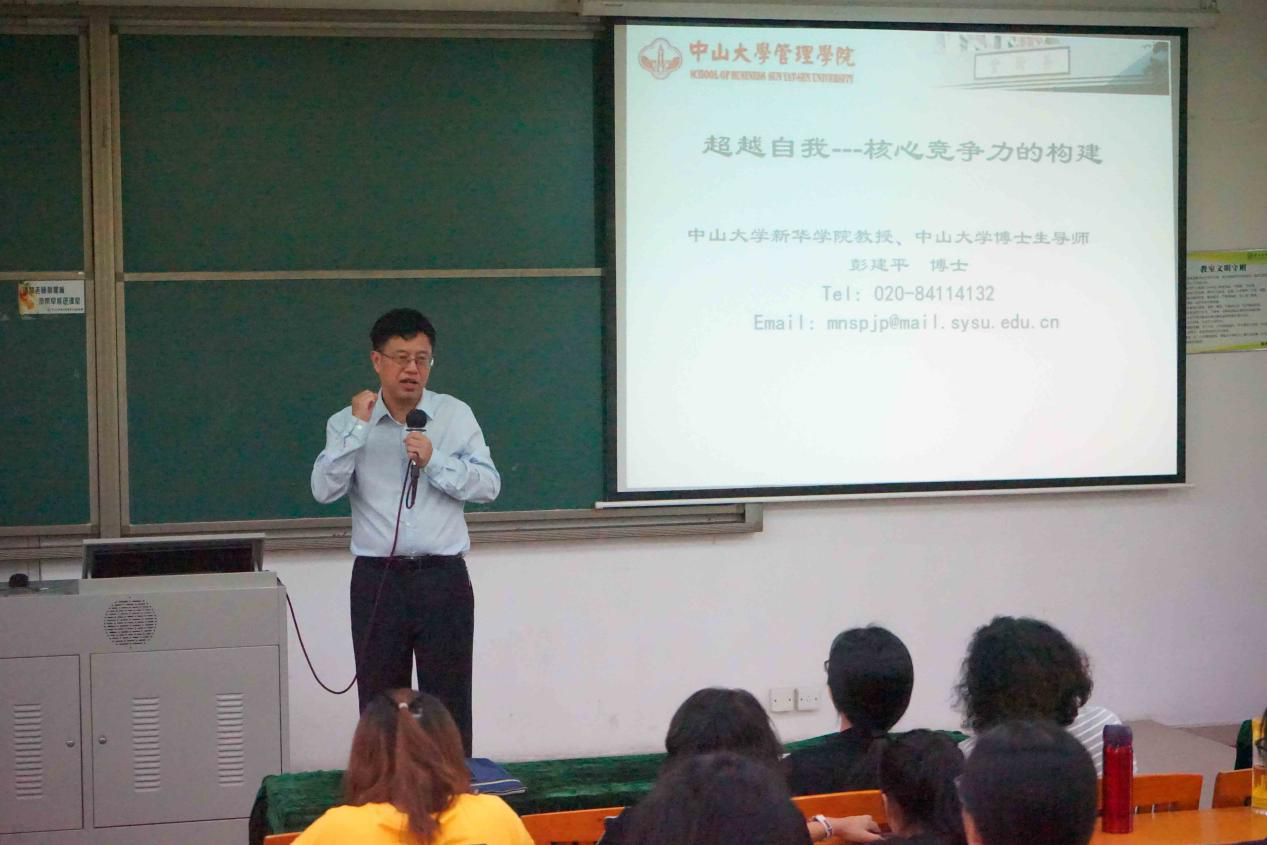 宣讲会伊始,管理学院彭建平院长通过介绍自身学习经历强调了外语学习以及精英教育的重要性。彭院长指出,跨专业学习有助于强化自身竞争力,同时,通过多学科的学习可以复制别人的成功,避免别人的失败。最后,彭院长还通过其他例子向在座的同学们介绍了工商管理在日常生活的应用。