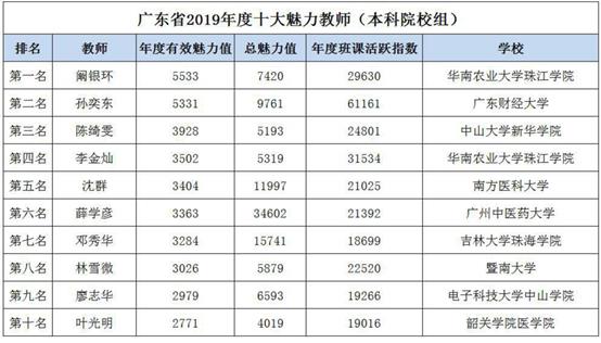 “广东省2019年度十大魅力教师(本科院校组)”排名如下:
