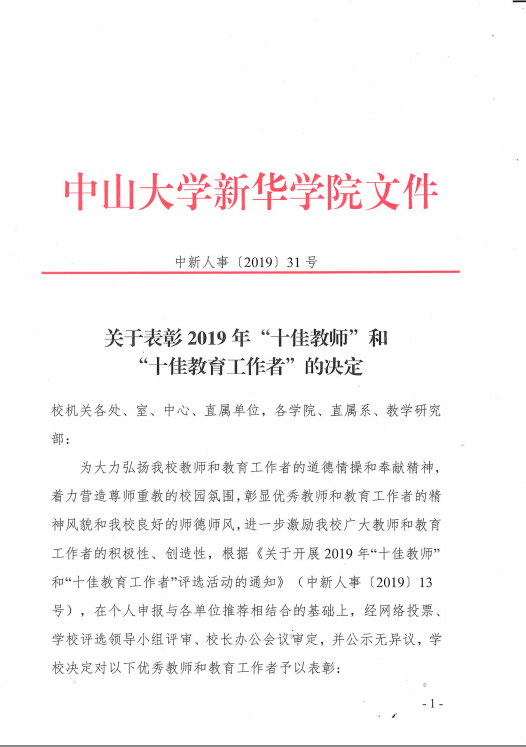 根据《关于开展2019年“十佳教师”和“十佳教育工作者”评选活动的通知》(中新人事〔2019〕13号)文件要求,经个人申报与单位推荐,人事处、教务处、学科与科技管理处审核、全校师生网络投票、信息与网络管理处统计票数等程序,学校评选领导小组评议会评议,校长办公会审定,入选中山大学新华学院2019年“十佳教师”的教师有9位,入选中山大学新华学院2019年“十佳教育工作者”的教师有9位。