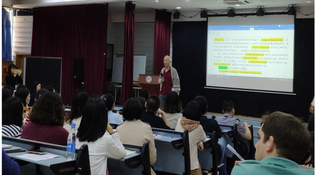 西班牙语语言文化学者,塞万提斯研究学者、散文家、翻译家、名誉教授、国内高校西班牙语专业通用教材《现代西班牙语》系列从书的作者——董燕生老师为大会致开幕词,从其自身数十年的教学经验出发,围绕如何获得高效和高质量的教学,侃侃而谈,强调老师及学生的态度,课前的充分准备,课上教学方法的多样化,并从口语及听力理解两个中国学生普遍反应困难的技能方面举出实际例子,讲述其系统的教学方法。演讲后与在场教师交流心得,进行指导。彭立家老师向其请教了西语课堂上教学方法使用与学生本身多样性的关联,及各种教学方法的局限性,董老师从自己的从教经验出发,进行了详细的讲解与解答。