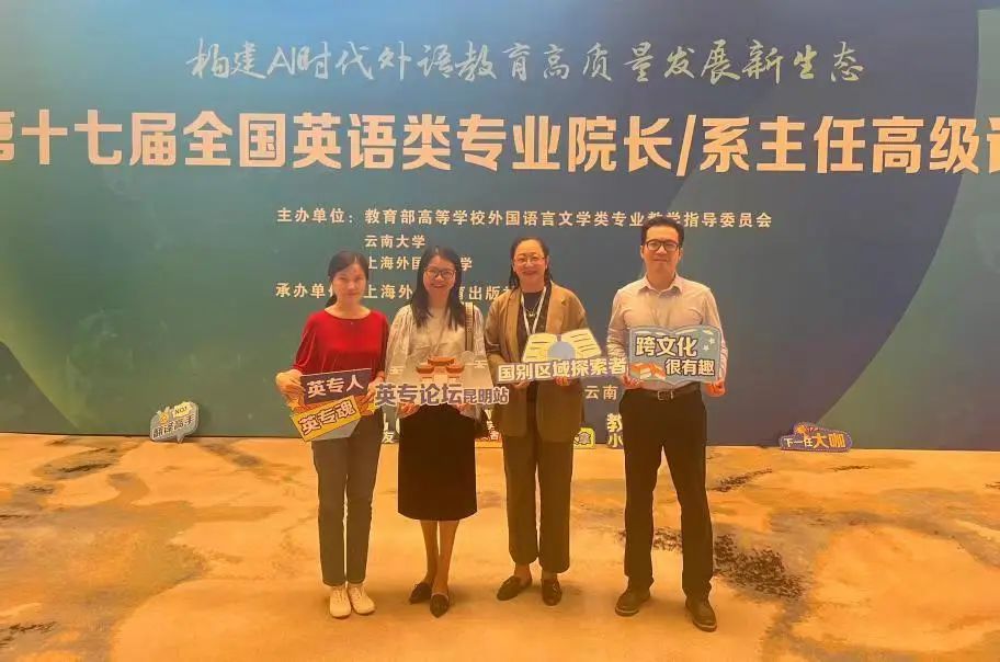 2024年4月11日—14日,第十七届全国英语类专业院长/系主任高级论坛在云南省昆明市召开。本届论坛的主题为“构建AI时代外语教育高质量发展新生态”,由教育部高等学校外国语言文学类专业教学指导委员会、云南大学、上海外国语大学主办。122cc太阳集成游戏党总支书记、副院长何瑜,122cc太阳集成游戏商务英语专业副主任洪茹,122cc太阳集成游戏实践部主任李思扬,英语专业翻译教研室主任龙娟,一行4名教师赴昆明参加了线下会议。