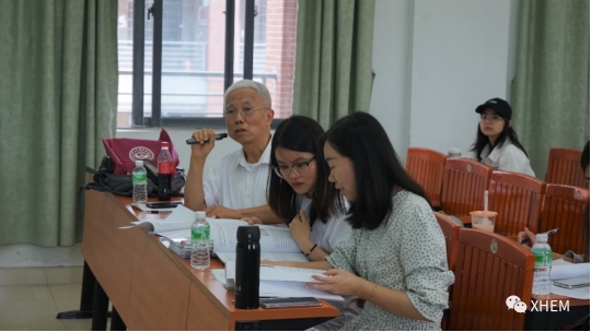 教学督导黄继炎(左一)给答辩学生提出修改意见
