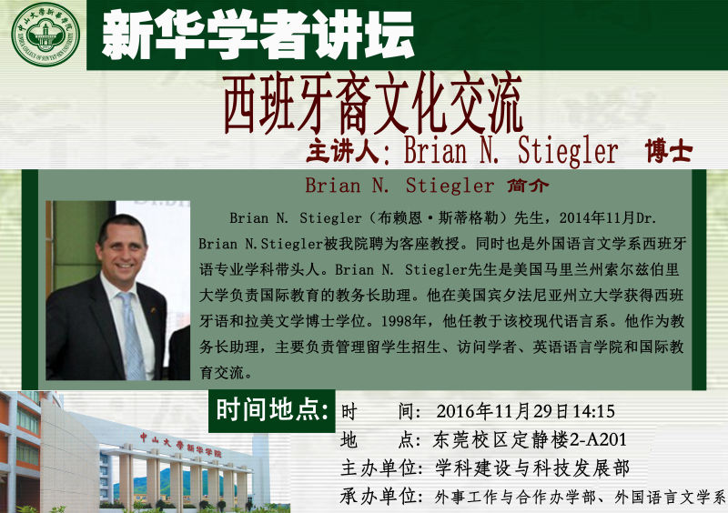 Brian N. Stiegler(布赖恩·斯蒂格勒)先生,2014年11月Dr. Brian N.Stiegler被我院聘为客座教授,同时也是外国语言文学系西班牙语专业学科带头人。Brian N. Stiegler先生是美国马里兰州索尔兹伯里大学负责国际教育的教务长助理。他在美国宾夕法尼亚州立大学获得西班牙语和拉美文学博士学位。1998年,他任教于该校现代语言系。他作为教务长助理,主要负责管理留学生招生、访问学者、英语语言学院和国际教育交流。