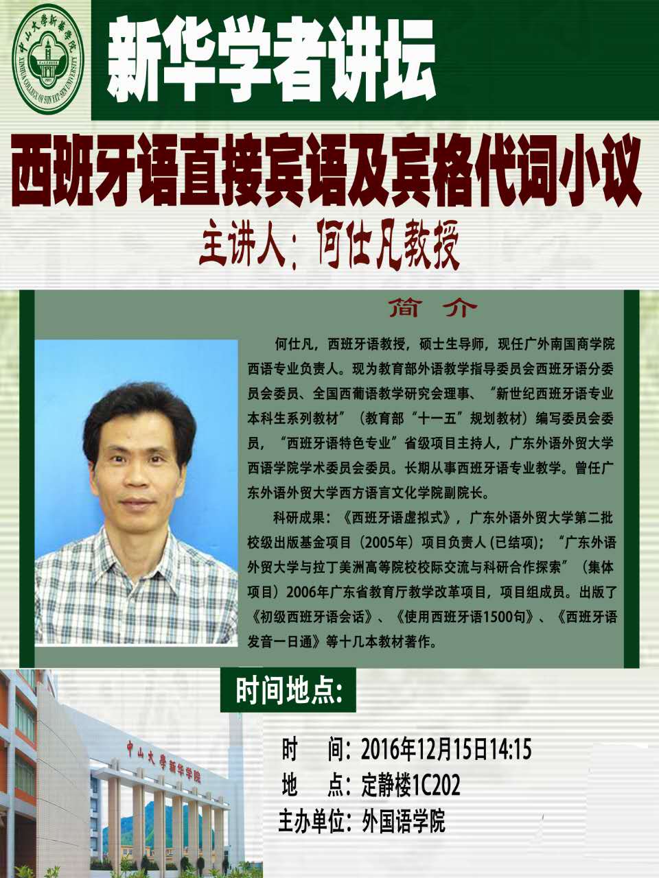 何仕凡,西班牙语教授,硕士生导师,现任广外南国商学院西语专业负责人。现为教育部外语教学指导委员会西班牙语分委员会委员、全国西葡语教学研究会理事、“新世纪西班牙语专业本科生系列教材”(教育部“十一五”规划教材)编写委员会委员,“西班牙语特色专业”省级项目主持人,广东外语外贸大学西语学院学术委员会委员。长期从事西班牙语专业教学。曾任广东外语外贸大学西方语言文化学院副院长。