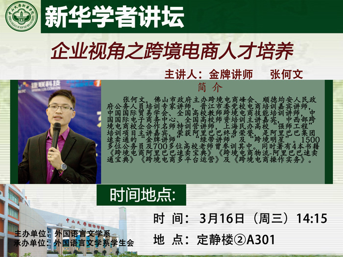 张何文,佛山市政府主办跨境电商峰会、顺德均安人民政府公务人员培训专家讲师,晋江市委党校电商培训嘉宾讲师,中国国际贸易学会、全国高校教师跨境电商技能培训讲师,中国国际电子商务中心、全国高校师资培训主讲嘉宾,中西部跨境电商校企合作名师特训营讲师,上海民办高校“强师工程”培训项目主讲嘉宾,荣获阿里巴巴终身荣誉,是阿里巴巴集团速卖通的“金牌讲师”、“绿带讲师”及“跨境明星”。1500多位公务员及700多位高校老师曾参训其中。同时著有4本书籍《跨境电商阿里巴巴速卖宝典》 《跨境电商物流-阿里巴巴速卖通宝典》 《跨境电商多平台运营》及《跨境电商操作实务》。