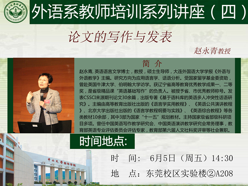 赵永青, 英语语言文学博士,大连外国语大学教授,硕士生导师。研究方向为应用语言学、话语分析。受国家留学基金委资助,曾赴英国牛津大学、伯明翰大学访学。获辽宁省高等教育优秀教学成果一、二等奖,是省级精品课“英语基础写作”的负责人。被授予省、市优秀教师称号。发表CSSCI来源期刊论文30余篇,出版专着《基于语料库的英语多人冲突性话语研究》。主编由高等教育出版社出版的《语言学实用教程》、《英语公共演讲教程》、北京大学出版社出版的《语言学教程纲要与实践》、《英语综合教程》等各类教材10余部,其中3部为国家“十一五”规划教材。主持国家级省部级科研项目多项。曾任中国英语写作教学研究会、中国英语演讲教学研究会常务理事,教育部英语专业评估委员会评估专家,教育部第六届人文社科奖评审等社会兼职。