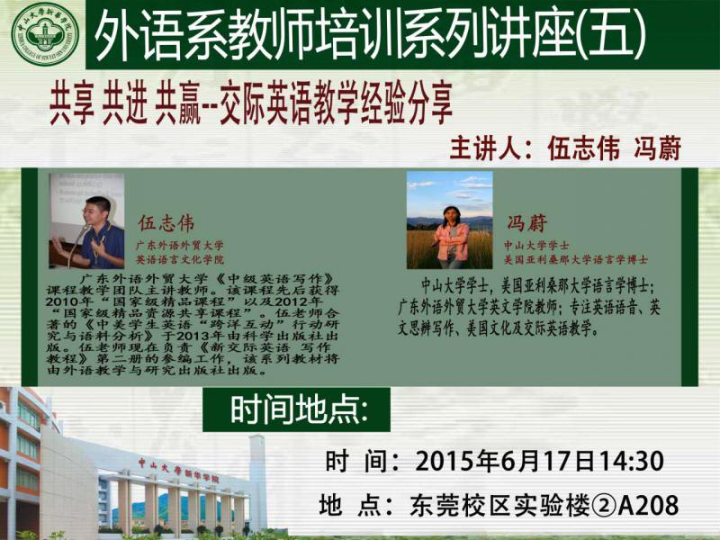 伍志伟,广东外语外贸大学《中级英语写作》课程教学团队主讲教师。该课程先后获得2010年“国家级精品课程”以及2012年“国家级精品资源共享课程”。伍老师合著的《中美学生英语“跨洋互动”行动研究与语料分析》于2013年由科学出版社出版。伍老师现在负责《新交际英语写作教程》第二册的参编工作,该系列教材将由外语教学与研究出版社出版。