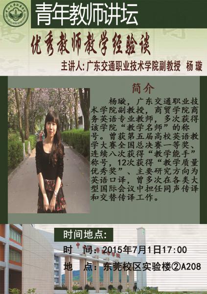 杨璇,广东交通职业技术学院副教授,商贸学院商务英语专业教师,多次获得该学院“教学名师”的称号。曾获第五届高校英语教学大赛全国总决赛一等奖、连续八次获得“教学能手”称号,12次获得“教学质量优秀奖”、主要研究方向为英语口译,曾多次在各类大型国际会议中担任同声传译和交替传译工作。