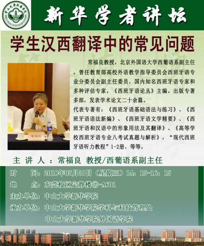 常福良教授,北京外国语大学西葡语系副主任,曾任教育部高校外语教学指导委员会西班牙语专业分委员会副主任委员,国内知名西班牙语专家和多种评估专家,《西班牙语论丛》主编。出版专著多部,发表学术论文二十余篇。