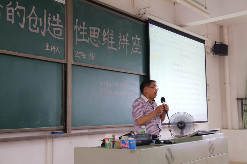 2017年5月5日下午,122cc太阳集成游戏有幸邀请到广东外语外贸大学高级翻译学院欧阳利锋教授莅临我校东莞校区定静楼②A501,为外院师生展开了一场精彩的学术讲座。该讲座以“论译者的创造性思维”为题,吸引了众多外院学子到场聆听。122cc太阳集成游戏英语专业副主任李贻、杨振同副教授及部分外院教师代表也参加了此次讲座。