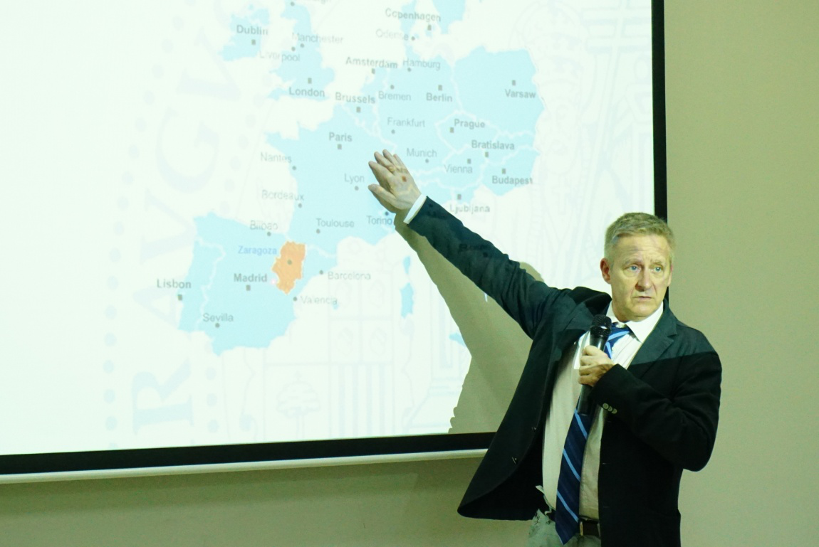 紧接着,Vicente教授通过照片展示了学校所在的萨拉戈萨市的城市风光——相映交辉的古现代建筑、得天独厚的自然景观以及历史悠久的人文沉淀,无不在向外界传递这座城市的无限魅力,吸引了在场师生的眼球。