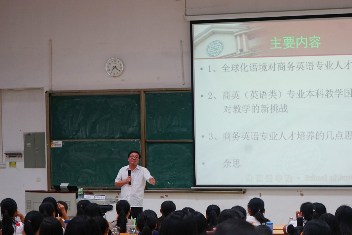 紧接着,许教授给向座师生详细分析了即将新颁布的《高等学校商务英语专业本科教学质量国家标准》(以下简称“新国标”)对商务英语专业未来的“教与学”所带来的影响及挑战。他说到,新国标对商务英语专业的师生都提出了更高的要求,对商务英语人才培养的模式及评估方式也产生了新变化。新国标对商务英语专业建设所提出的新要求体现在以下三个方面:一是“三个统一”,即知识、能力、素质的统一 ;语言、商务、文化素养的统一;内容创新、教学创新与技术创新的统一(第一、第二、第三课堂的联动、课内培养与课外实践的融合、常规培养模式与互联网+培养模式的交汇)。二是“四个提高”,即提高英语语言表达的能力;提高运用商务知识的能力;提高跨文化商务交际的能力以及提高文化素养和思辩批判的能力。三是“五个转化”,包括从语言知识到语言技能的转化;从商务知识到商务技能的转化;从跨文化知识到跨文化交际能力的转化;从文化知识到人文素养的转化以及从一技之长到终身学习能力的转化。其终极目标是帮助学生完成从语言能力、商务能力、跨文化交际能力到具有批判思维能力的“全人”的转化,实现知识、能力与素质的统一,完成“全人”培养的过程,从而达到“全人”培养的专业建设目标。
