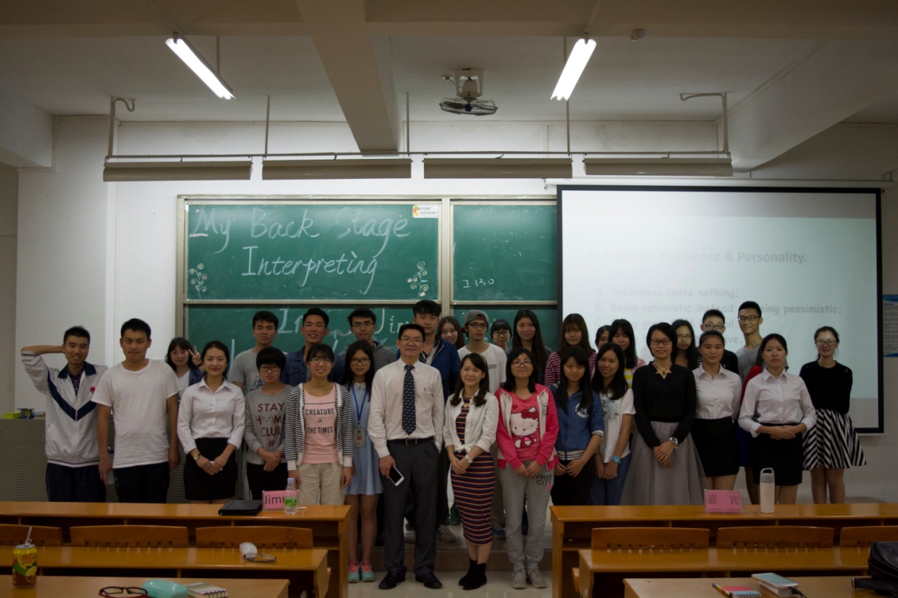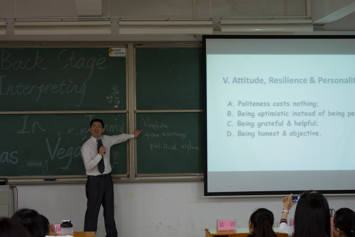 2016年4月13日,由外国语言文学系主办,外国语言文学系团总支承办的文化论坛讲座——" My Back Stage Interpreting in Las Vegas" 于我院东莞校区举行。本次讲座诚邀外籍专家Professor Jimmy来院讲学,外语系办公室副主任欧衍伽老师及外语系师生代表共同聆听了本次讲座。