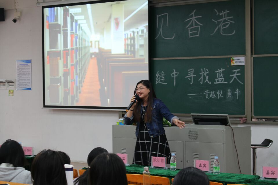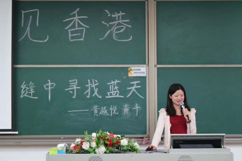 首先开讲的是黄越悦老师。说到香港,大家对其的印象都是大同小异的:加班文化,尤其是金融行业的加班甚多;各种各样的节日活动,气氛浓厚;更值得一提的是香港迪士尼乐园。这是大家印象中的香港,可在黄越悦老师眼里,香港变得具体化了。她先以电影片段《重庆的森林》引入主题,因为重庆大厦被喻为香港曾经的九龙城寨,是一个小型的社会。她说道在香港看蓝天得从夹缝里看,因为楼宇密集。虽然高楼大厦多,但它的房价是高不可及,对此,她提到读研时在香港租很小单间,租金要3000多港币的经历。然后她分享了目前香港年轻人的困境,如楼价高,收入低,退路窄,父母支持有限等。虽说困境重重,但是香港的年轻人很热血,很有个性,会为自己人生努力奋斗,这种奋斗的精神很值得大家学习。再者,黄老师在香港生活期间,她认为其公共设施和康健设施十分完善,香港政府在这些方面投入甚多。同时黄老师也分享她在香港中文大学学习生活的感受。作为香港面积最大的高等学府,不仅有很多有意义的讲座和可自由选择的书院制度,还有24小时服务的多个图书馆和完善的学业就业咨询中心。另外,校园设施完善,服务到位,校园活动精彩。最后黄老师以歌曲《狮子山下》结束她的演讲,让人意犹未尽。