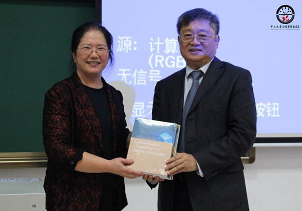 图2 王桂珍教授(左)开展讲座,王庭槐院长(右)代表学院接受赠予我院的英语教材
