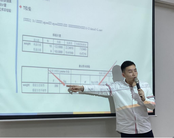 我院教师贾再俊在会上为大家介绍了主要的科研情况,并分享自己进行科研工作的体会。他重点介绍了“SPSS”软件对于科研的具体帮助,并亲自进行演示。同时,他还建议老师们可以多参加学术会议,学习同行或前辈经验。