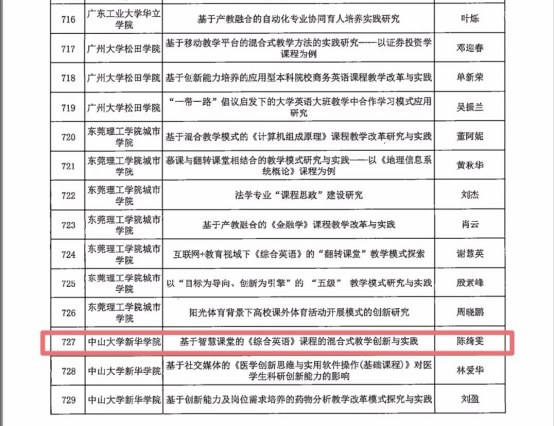 根据广东省教育厅发布的《广东省教育厅关于公布2019年广东省高等教育教学改革项目立项名单的通知》,我院陈绮雯老师的“基于智慧课堂的《综合英语》课程的混合式教学创新与实践”成功立项