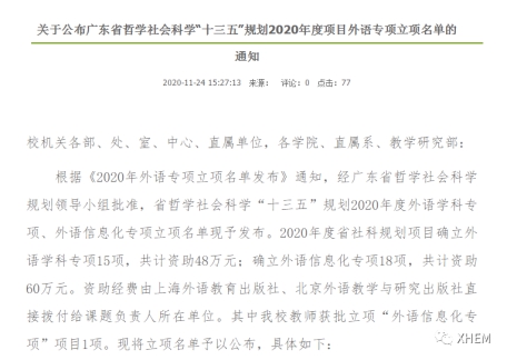 根据《2020年外语专项立项名单发布》通知,经广东省哲学社会科学规划领导小组批准,省哲学社会科学“十三五”规划2020年度外语学科专项、外语信息化专项立项名单现予发布。2020年度省社科规划项目确立外语学科专项15项,共计资助48万元;确立外语信息化专项18项,共计资助60万元。资助经费由上海外语教育出版社、北京外语教学与研究出版社直接拨付给课题负责人所在单位。