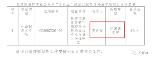 其中,我院专职教师贾再俊老师的“教育信息化背景下高校外语教师在线专业发展共同体研究”,获批立项“外语信息化专项”项目。