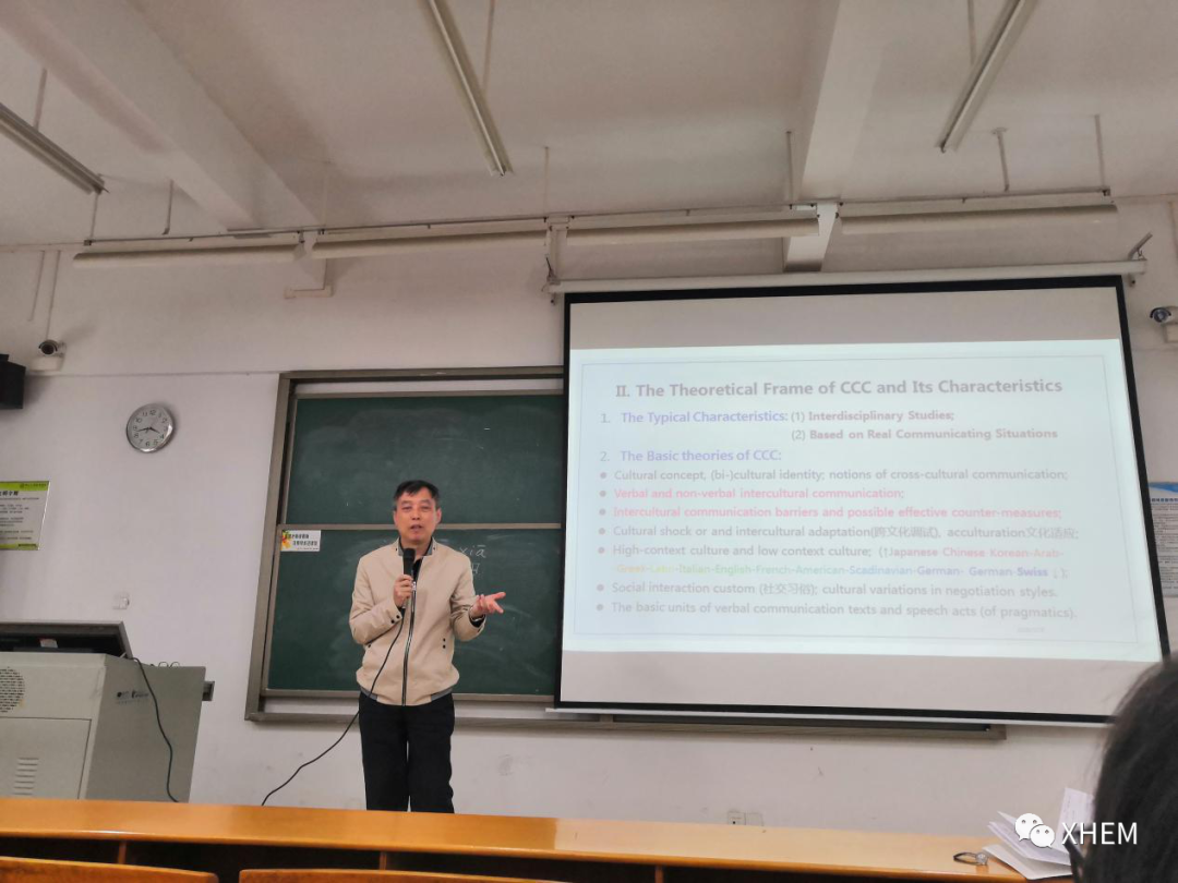 讲座正式开始后,牛励强教授就跨民族文化交际与同一民族文化跨区域交际的语言与非语言因素表达了自己的见解,从跨文化交际理论出发,把跨民族(跨国籍)文化交际和同一民族(主流)文化背景下跨区域交际中的语言因素和非语言因素进行分析比较,从而阐明各自的定位、参与量、参与方式。通过境内境外八组案例分析,使学生对讲座的主要问题有较为深刻的领悟,耳目一新,醍醐灌顶,理解了跨民族交际策略和跨区域交际策略差异的所在,达成了有指导意义的结论。