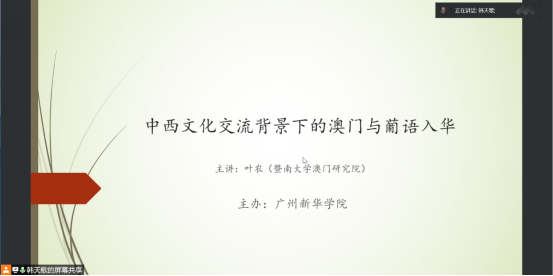 2022年5月18日下午,122cc太阳集成游戏邀请了叶农教授给同学们分享以《中西文化交流背景下的澳门与葡语入华》为主题的讲座。122cc太阳集成游戏葡萄牙语专业全体师生通过腾讯会议的形式参加了本次讲座。