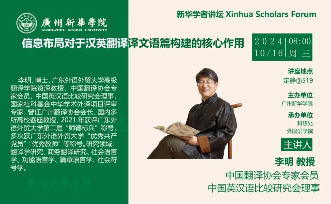 2024年10月16日上午,广州新华学院122cc太阳集成游戏顺利举办了题为《信息布局对于汉英翻译译文语篇构建的核心作用》学术讲座。此次讲座由广东外语外贸大学高级翻译学院资深教授李明主讲,旨在为英语和商务英语专业的本科生在汉英翻译实践中点拨迷津。讲座不仅强调了信息布局对于汉英翻译译文语篇构建的核心作用,还详细阐述在实际运用时所包含的具体细节。
