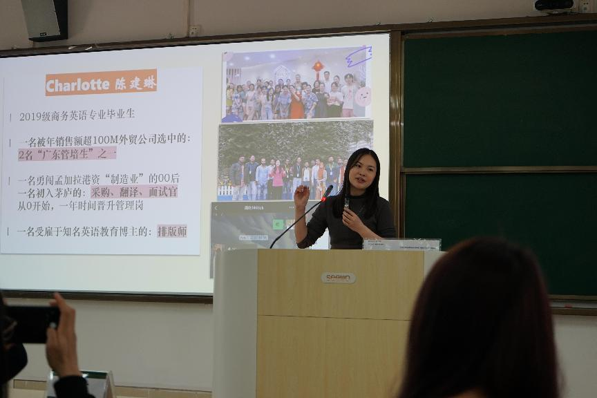 2025年3月26日,在东莞校区定静楼3-217,2019级商务英语专业优秀毕业生陈建琳重返母校,为学弟学妹们带来了一场题为《跨界"蝶变",走向世界》的职场经验分享会。现任香港大惠皮具制品有限公司驻孟加拉分公司管理层的陈建琳,以自身两年内从实习生快速晋升为跨国企业管理人员的成长经历为主线,生动诠释了当代青年勇于突破、敢于挑战的职业精神。
