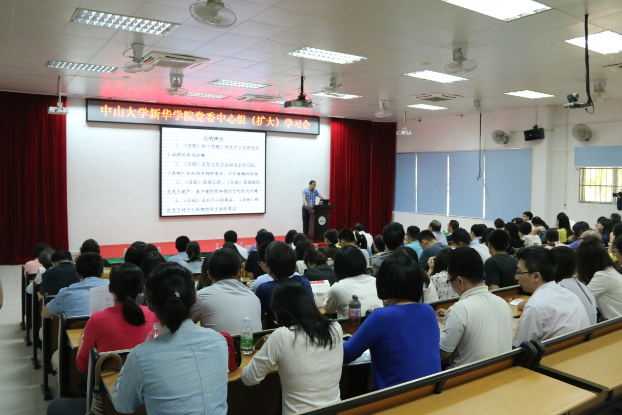 5月11日,学院党委中心组扩大学习会在广州校区召开。会议特邀中山大学纪委副书记、监察处处长何晓钟为与会人员作《中国共产党廉洁自律准则》(以下简称《准则》)和《中国共产党纪律处分条例》(以下简称《条例》)学习培训。学院党委副书记、副院长蓝永金,各系(部)正副职负责人,副科级以上管理人员,党支部书记、委员以及教工党员参加了会议。会议由学院党委书记刘美南主持。
