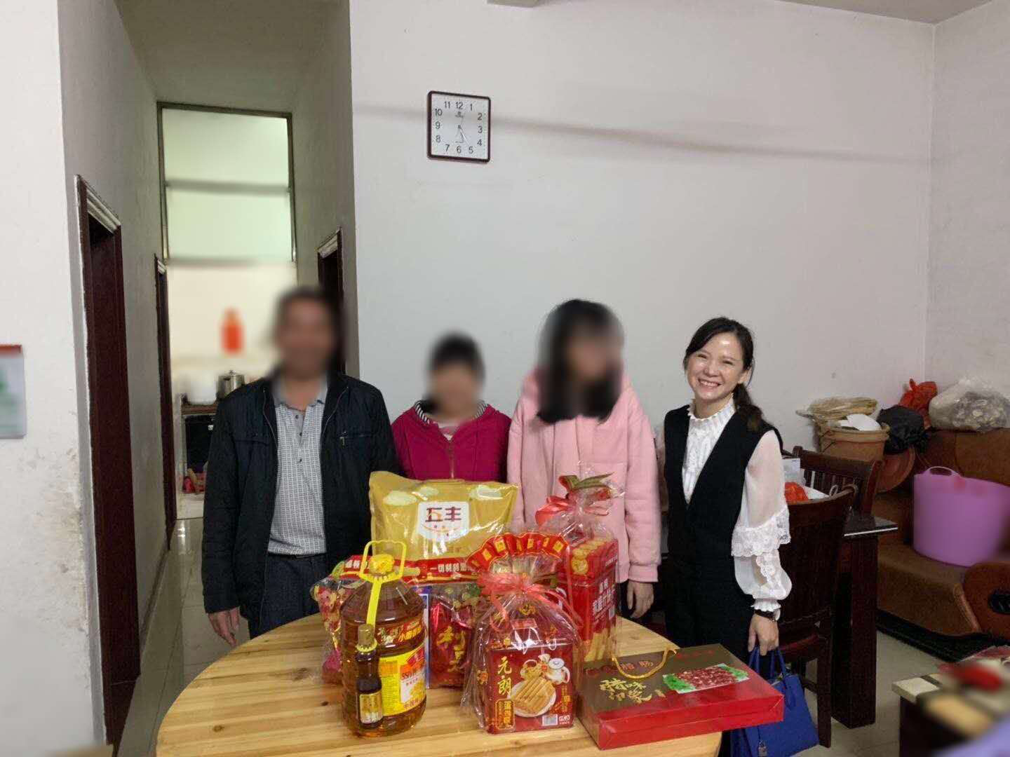 教师代表欧衍伽与家庭经济困难学生家庭合影留念