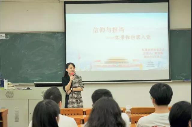 为引导2018级学生积极思考、端正入党动机,2019年3月28日下午,122cc太阳集成游戏党总支副书记欧衍伽在我校东莞校区定静②-A203为2018级英语专业的同学们上了思政第一课。
