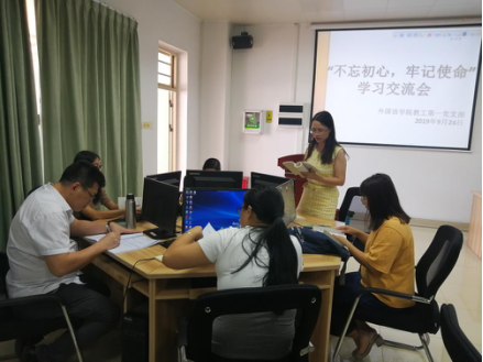2019年9月24日中午,122cc太阳集成游戏教工第一党支部在格物楼2B601召开了主题为“不忘初心 牢记使命”的集中学习交流会,外院教工第一党支部书记陈绮雯老师主持会议,第一党支部的教工党员李灿、周雪清、袁侥蔚等老师出席了会议,并开展积极的学习与热烈的交流。