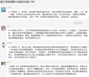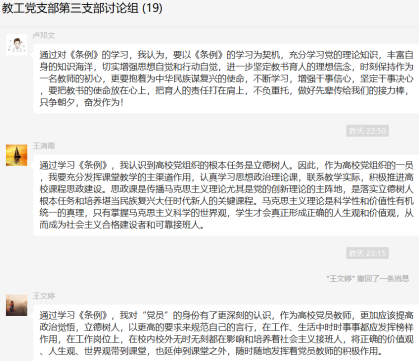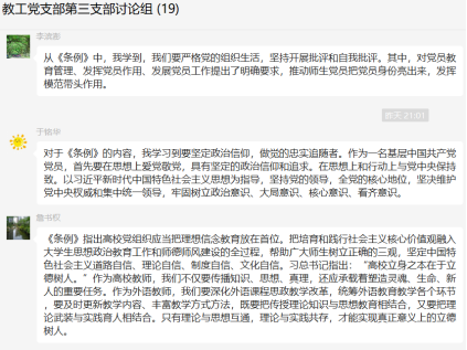 通过对《条例》的学习,支部各成员对高校的党组织结构和基层组织活动要求有了更加全面和深刻的认识。老师们结合自己的所见所闻所想,纷纷发表自己的学习感言。