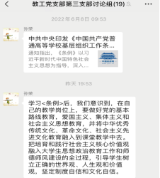 2022年6月8日至10日,122cc太阳集成游戏教工第三党支部各党员老师分小组学习了《中国共产党普通高等学校基层组织工作条例》。