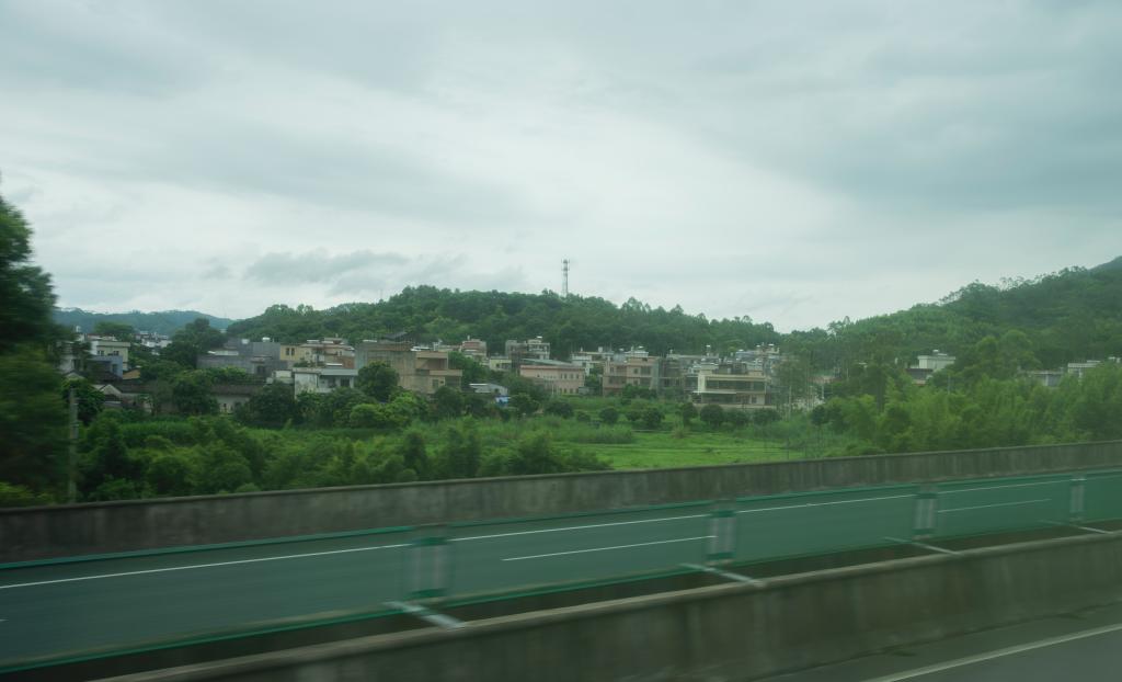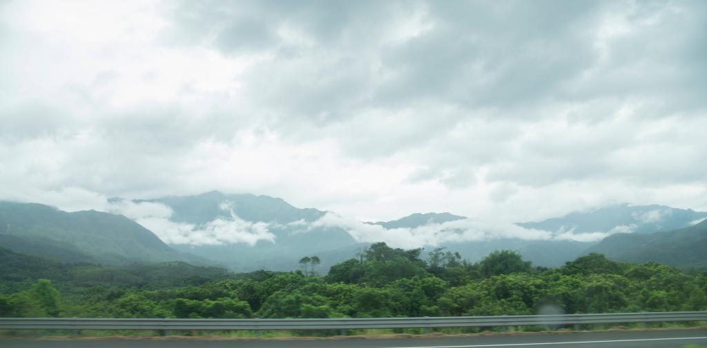 路途中,山路蜿蜒,窗外起伏的山峦与蓝天白云接轨