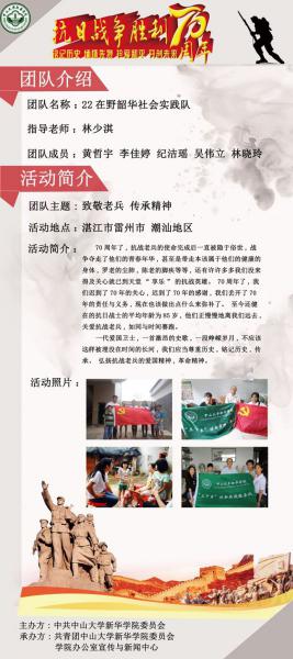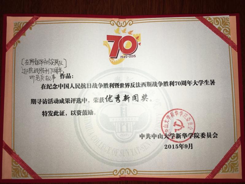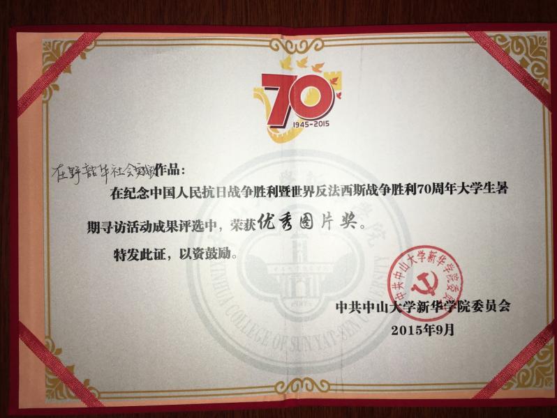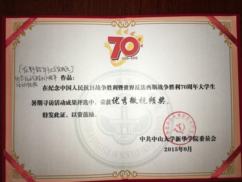 2015年10月14日10点,外语系“在野韶华”社会实践团队的队员参加了我院纪念抗战胜利70周年大学生暑期寻访活动总结交流大会,聆听中山大学抗战老兵陈化成同志的抗战故事,与优秀队伍分享、交流活动成果。在表彰中,我系“在野韶华”团队斩获了“优秀微视频奖”、“优秀新闻奖”、“优秀图片奖”三个奖项。