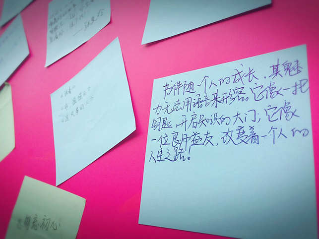 在工作人员的努力以及同学们的热情参与下,分享墙上贴满了同学们对阅读的感悟以及自己心中最喜欢、最想与大家分享的书籍。