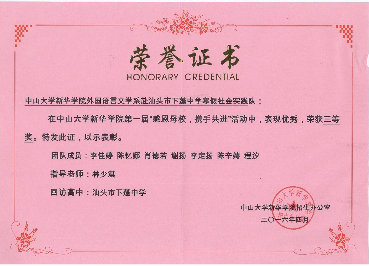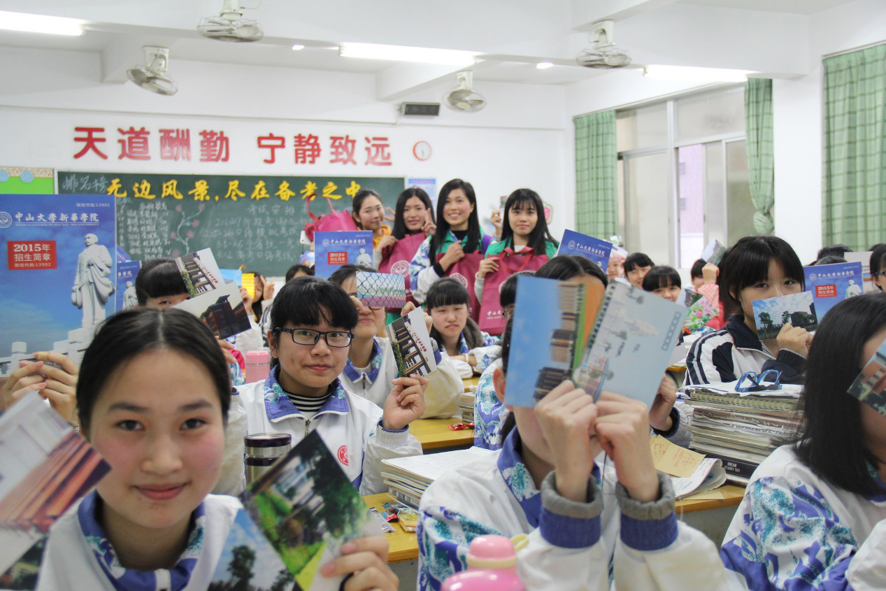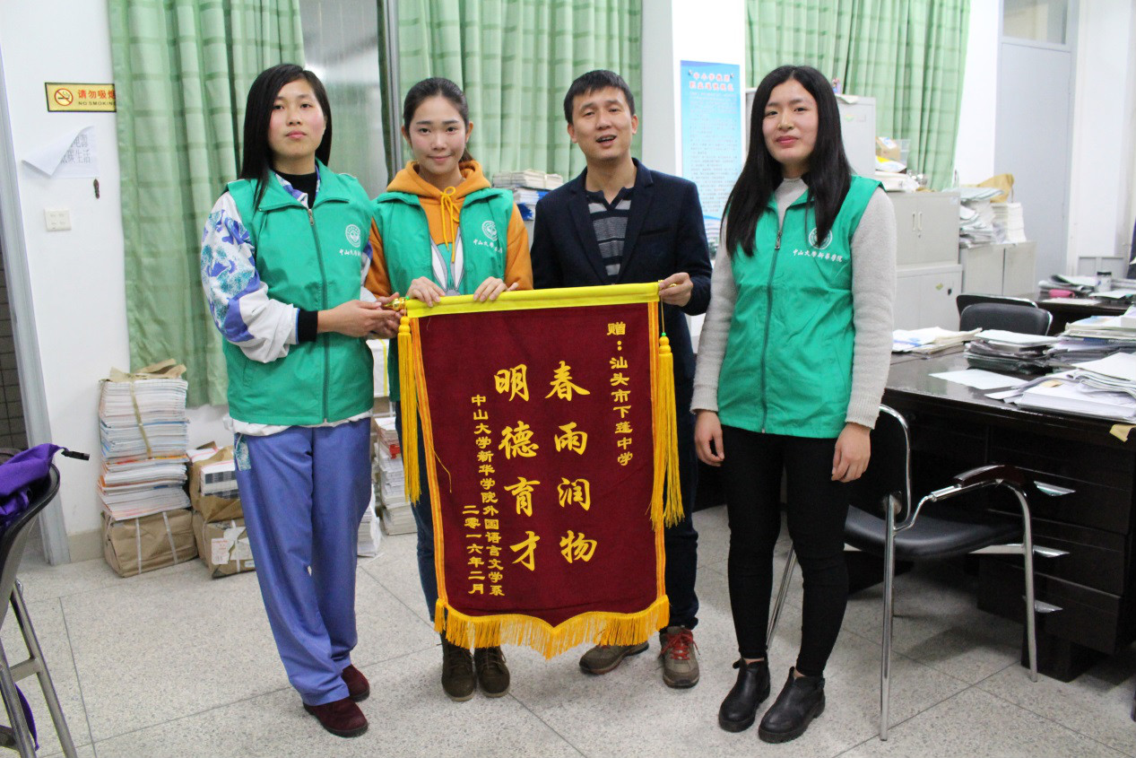 在这次活动中,外语系寒假社会实践小分队赴母校汕头市下蓬中学,进行了一系列感恩母校的回访活动,包括拍摄感恩母校视频,制作感恩锦旗、明信片,采访母校恩师以及举办感恩母校及校文化宣传主题班会。在感恩母校的主题班会上,队员们向母校的师弟师妹们派发了中山大学新华学院招生简章及印有中大新华校园风景的明信片,并鼓励大家好好学习,珍惜美好的中学时光。