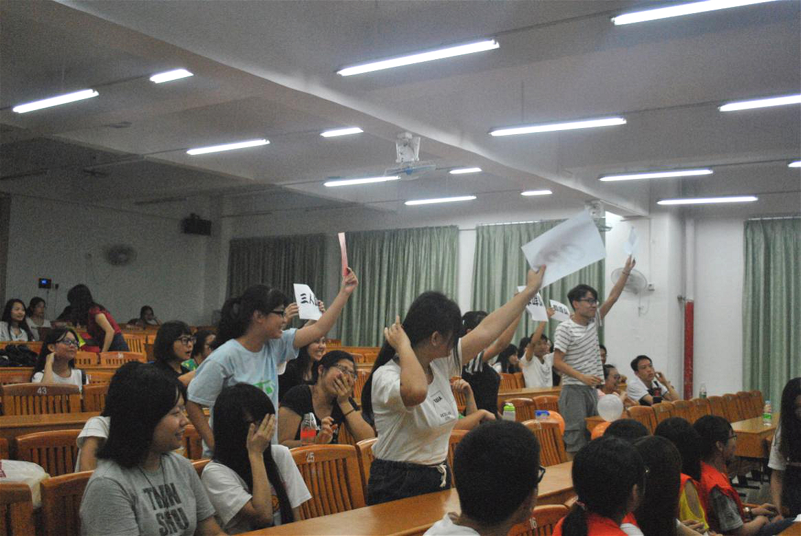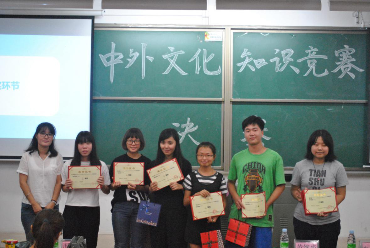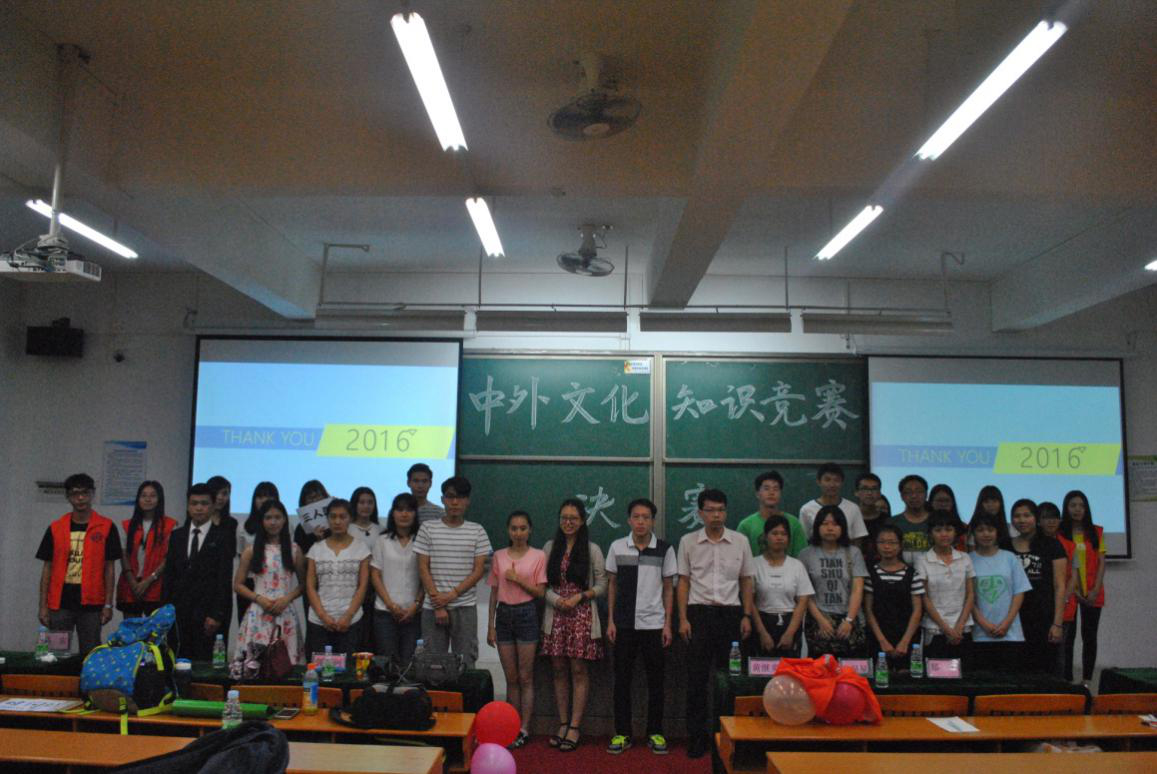 2016年6月1日晚,大家期待已久的中外文化知识竞赛决赛在我院东莞校区定静楼②A202举行。本次决赛诚邀外语系副主任黄继炎,外语系辅导员郭梦珂、邢佳佳及梅星星担任评委老师。外语系团总支副书记陆荣生、财会系学生会主席伍裕隆、公管系学生会主席赵珊莹、百思英语协会会长刘雯慧所组成得学生代表团也一同为现场参赛选手加油打气。
