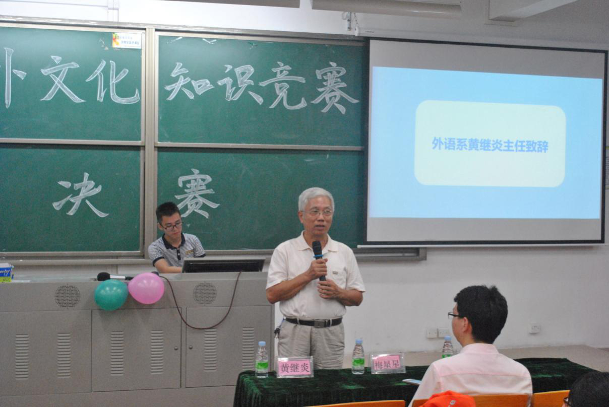 决赛开始,黄继炎副主任为比赛致辞。他说道,除了学习外语知识,大家更要学会文化交流,懂得尊重文化,并能够了解和掌握更多中外文化知识。文化交流在现代社会有着举足轻重的地位,大家要不断地进行文化交流,人类文明才能进步。希望一年一度举办的文化知识竞赛,不但能够让同学们对文化有更多的了解和学习,更能唤起大家对于文化传承的责任感和使命感。