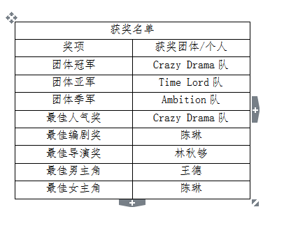 经过现场评委认真的打分之后,15级商英CD班Crazy Drama队在众多剧组中脱颖而出,凭借作品《Les MiserablesⅡ》摘得了本次话剧比赛的冠军殊荣。Time Lord队以作品《Doctor of the Fairy Tale World Tour》夺得亚军,Ambition队以作品《A Midsummer Night’s Dream》夺得季军。同时,Crazy Drama队获得最佳人气奖,Time Lord队的陈琳同学获得最佳编剧奖,Ambition队林秋够同学获得最佳导演奖。王德、陈琳凭借入目三分、收放有度的表演分别获得最佳男、女主角奖。