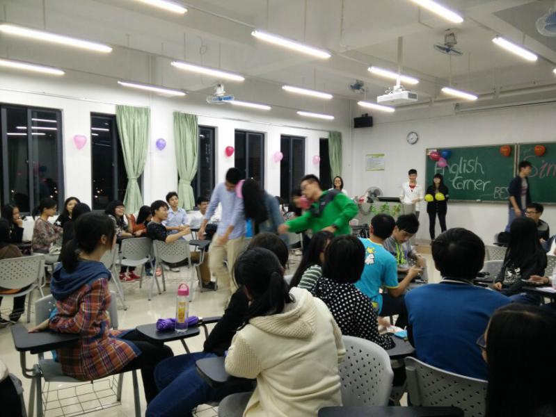 英语角活动始终围绕“Culture”,“Communication”,“Creativity”为宗旨,分别以主持人介绍嘉宾、嘉宾发言并分享他们的单身生活、运气球、YES OR NO游戏、以及Free Talk为环节。欢笑不断的当然是男女生组合运气球的环节了,由于游戏规则的相当劲爆—必须在不用手的情况下将气球挤爆,促使男女生不得不有“亲密”接触才能将其挤破,这不仅唿应了这期的主题,还让在场的观众捧腹大笑,纷纷跃跃欲试,无疑把场内的气氛推到了高潮。还有YES OR NO游戏也得到了观众的青睐,这样的猜单词说是与不是,相信这给观众带了深刻的印象之外,更多的是体会到英语的韵味。活动精彩,百思的未来更精彩。