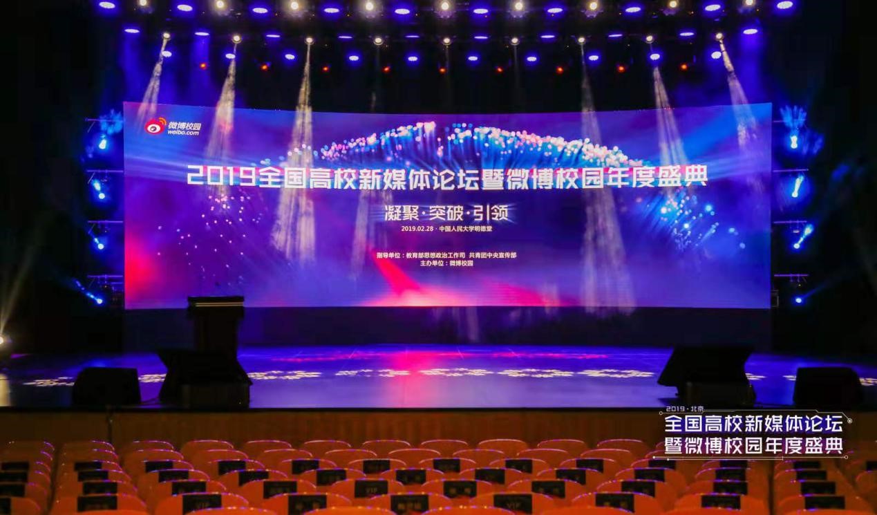 2月28日,2019全国高校新媒体论坛暨微博校园年度盛典在北京中国人民大学如渝讲堂举行。本次论坛以“凝聚•突破•引领”为主题,全方位探讨了高校新媒体发展的新趋势、新思路。活动由教育部思想政治工作司、共青团中央宣传部指导,微博校园主办,中央网信办、教育部、共青团中央、北京市教委、河南省教育厅和江苏共青团省委等单位相关同志、清华大学、浙江大学等高校领导、老师、学生骨干等共计约900人参会。