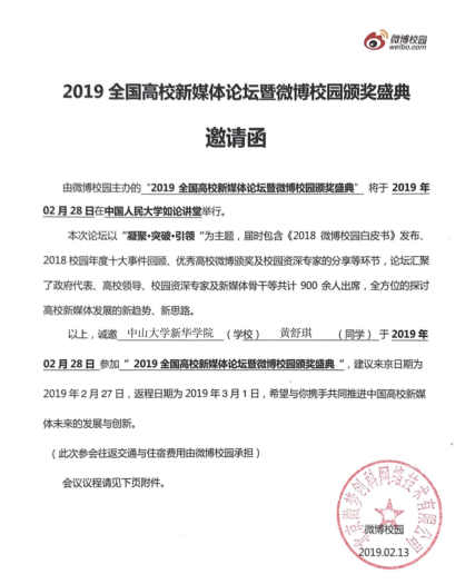 衷心感谢新浪微博提供这个平台以及学校老师的支持,能让我有这个机会去学习其他高校微博建设以及自媒体的建设之路,希望我们学校也能够重视起微博校园,争取在明年的全国高校新媒体论坛暨微博年度盛典上中山大学新华学院也能够得到大家的认可,一起为服务高校学子贡献出自己的一份力量。