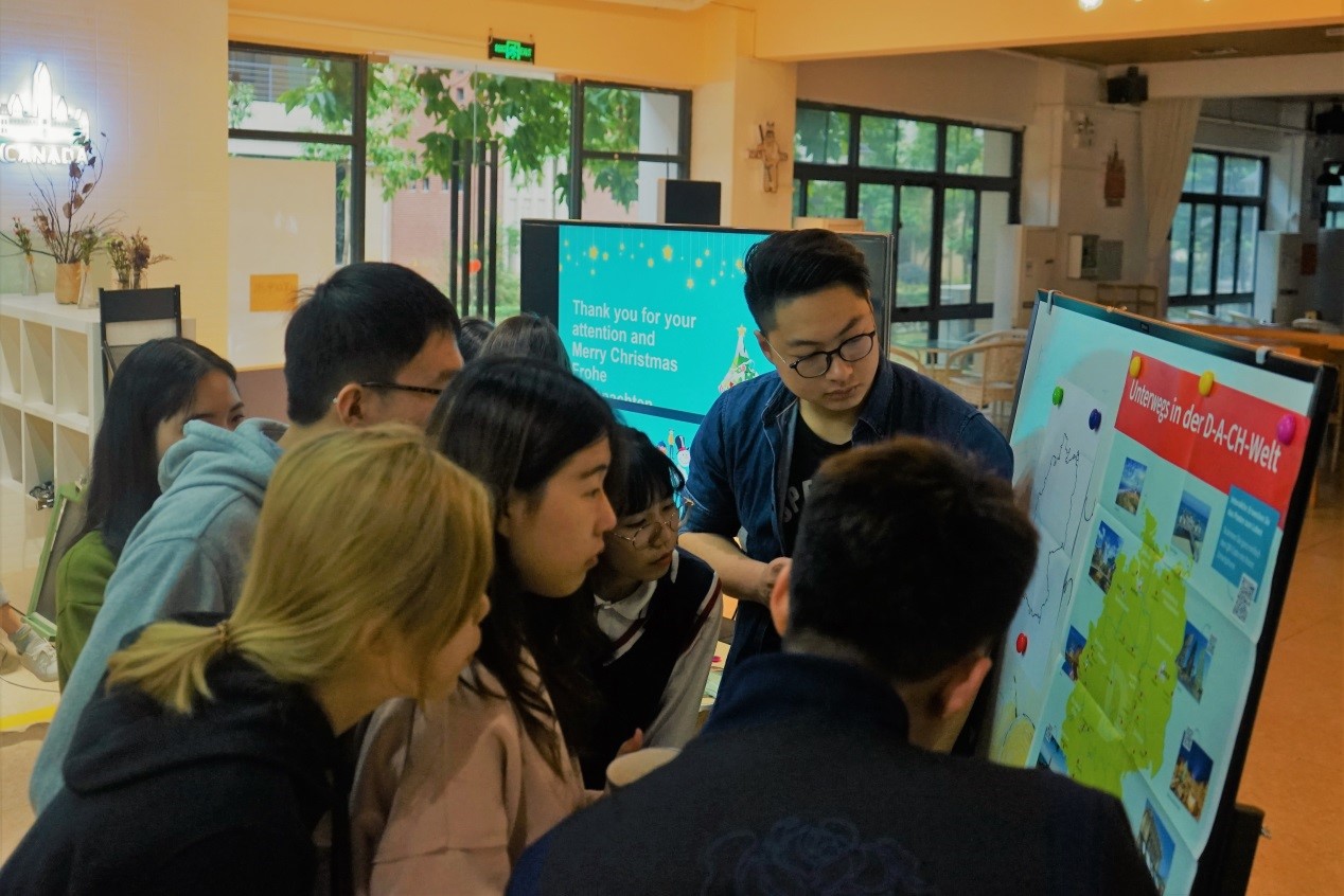 在热红酒煮好之前,洪老师带领在座师生进入游戏环节。第一个游戏是让同学们在地图上找出德国的城市,而第二个游戏是让同学们在地图上找出德国的接壤国家。同学们积极上场作答,活动气氛十分活跃。游戏结束后,在场师生品尝了红酒和糕点。红酒色泽光亮,盛装在马克杯里,每个人手里捂着满满一杯热红酒,合着水果的香甜、葡萄酒的醉人酒香扑鼻而来,馥郁浓烈。喝一大口,滚热落胃,从舌头一直暖到胃里,每个毛孔都舒展了。再吃一口糕点,酸甜可口,在座师生都沉浸在美食之中。