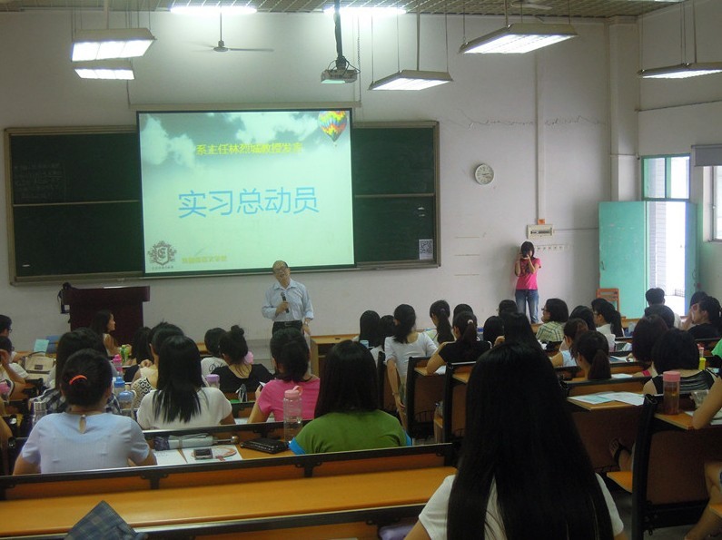 首先,和蔼亲切的林烈城主任以" Two Horses Effect "、" Taking Risks Is Good To Us "等四则英语警言故事,给同学们阐述了在实际工作中个人的付出是领导衡量员工价值的一个重要参考因素。随后,欧衍伽老师则细心全面地给同学们介绍了英语专业实习大纲、实习安排时间和实习教学安排表,同时也详细讲解了实习手册、实习报告书等材料的填写要求以及实习安全注意事项等。