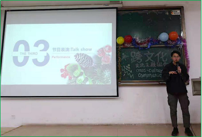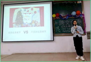 首先由17H班的刘念斯同学为大家带来跨文化主题演讲,她与大家分享了对圣诞节与春节蕴含的文化传统意义的个人见解,以及如何正确看待圣诞节与春节的想法,将本学期写作课上的思辨延续到了课外。
