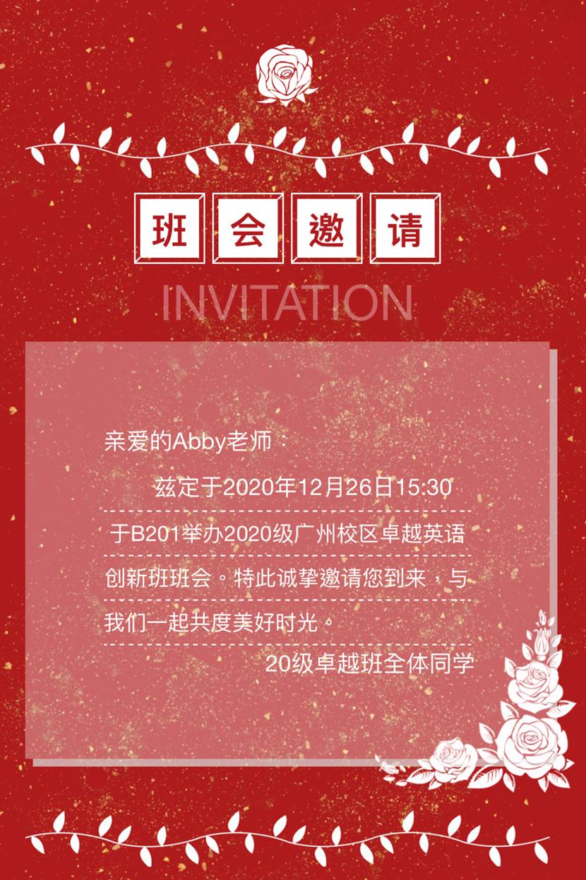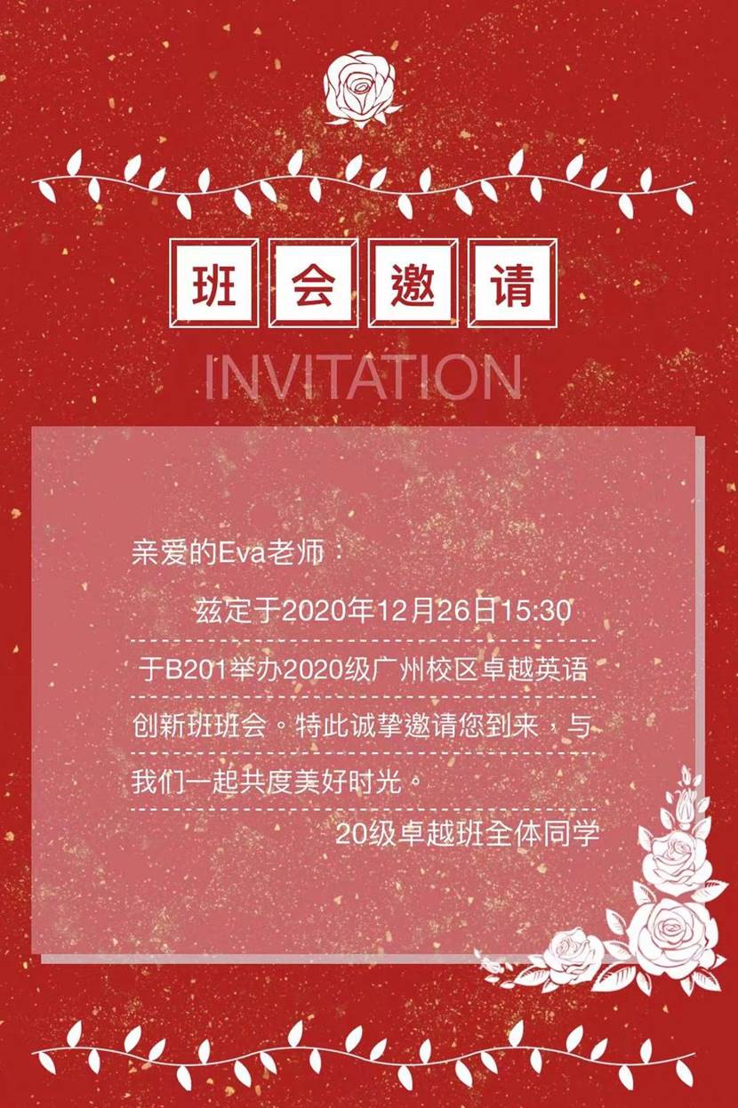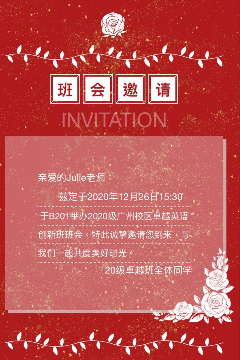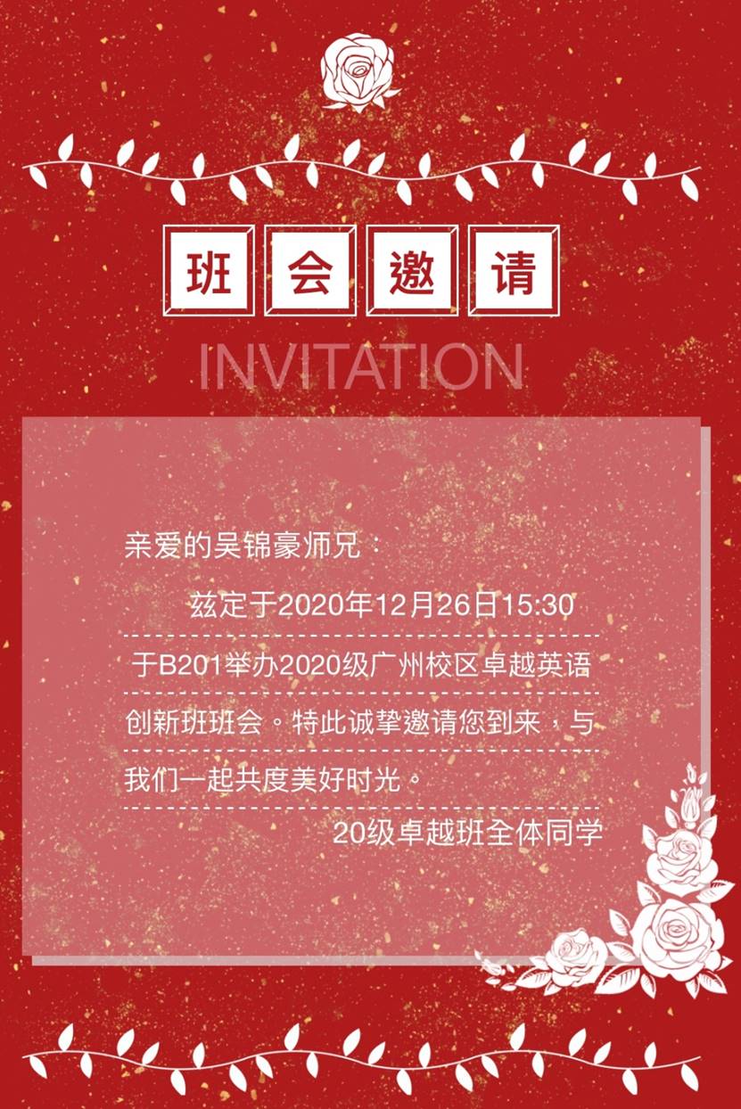 12月中旬,20级广州卓越班班长向任课老师、19级的班导以及全班同学发送邀请函,邀请大家参加20级广州卓越班的期末总结会暨班级破冰活动。