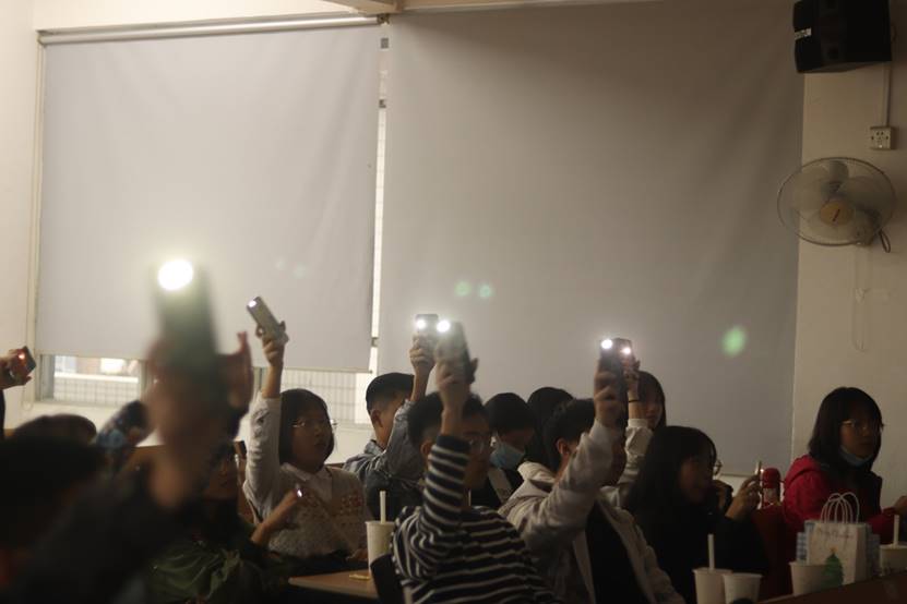 游戏环节过后,岳华威、夏梓菡和周淳熙三位同学分别演唱了《会不会》《当你》《只有你不知道》,歌声悦耳,其他同学纷纷化身小粉丝,亮起了手机的闪光灯为他们打call。