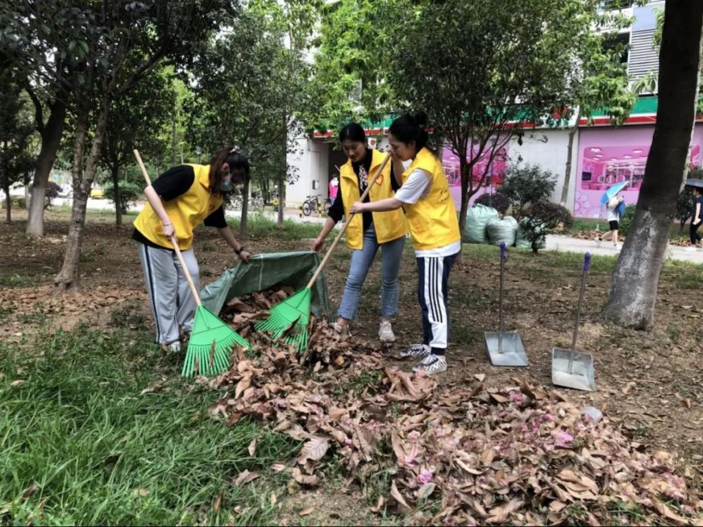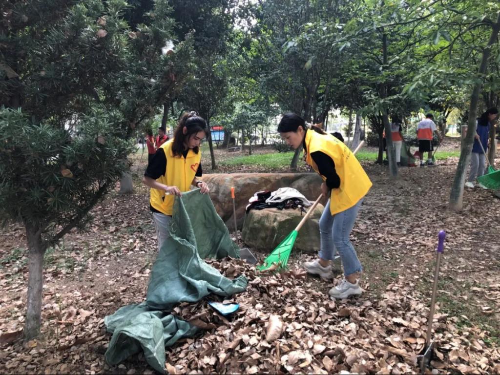 六栋的空地前,是一片鸟语花香的小树林,也是今天打扫的“重头戏”。遍地的落叶打扫起来可不是一件容易的事。但在志愿者和老师齐心协力、分工合作下,小树林很快被收拾完毕。